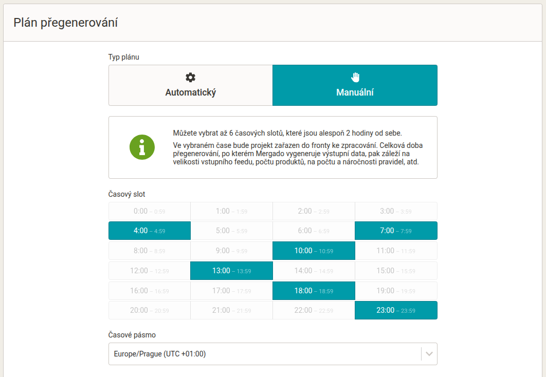 Plánovač přegenerování umožňuje nastavení konkrétního časového plánu, kdy se budou datové feedy automaticky aktualizovat (tzv. přegenerování). Přegenerování feedu vám zajistí, že data produktů jsou na výstupu z MERGADA co nejaktuálnější a odpovídají například aktuálnímu stavu cen, zásob apod.