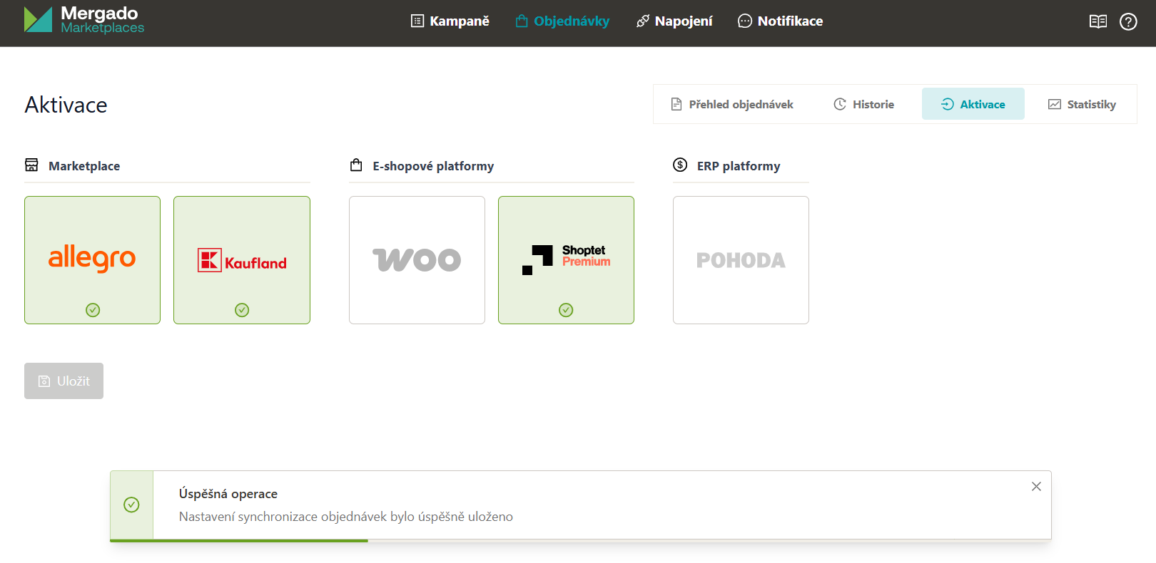 Přejděte do sekce Objednávky > Aktivace a aktivujte synchronizaci a uložte změny. Synchronizaci můžete na stránce aktivace kdykoliv jednoduše pozastavit.