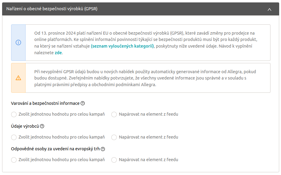V závěru sekce Mergado je třeba vyplnit informace spojené s nařízením GPSR. Více informací naleznete zde.