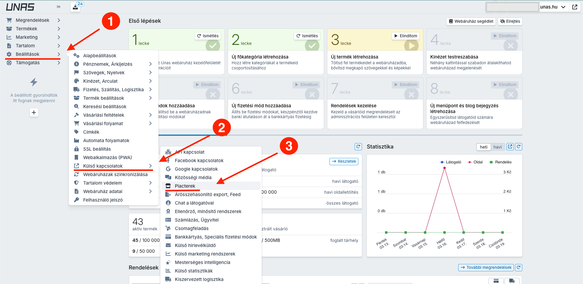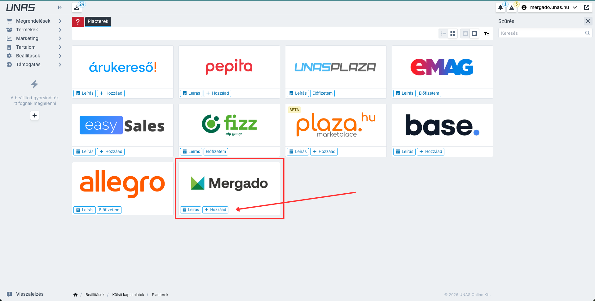 Jděte do části Beállítások → Külső kapcsolatok → Piacterek