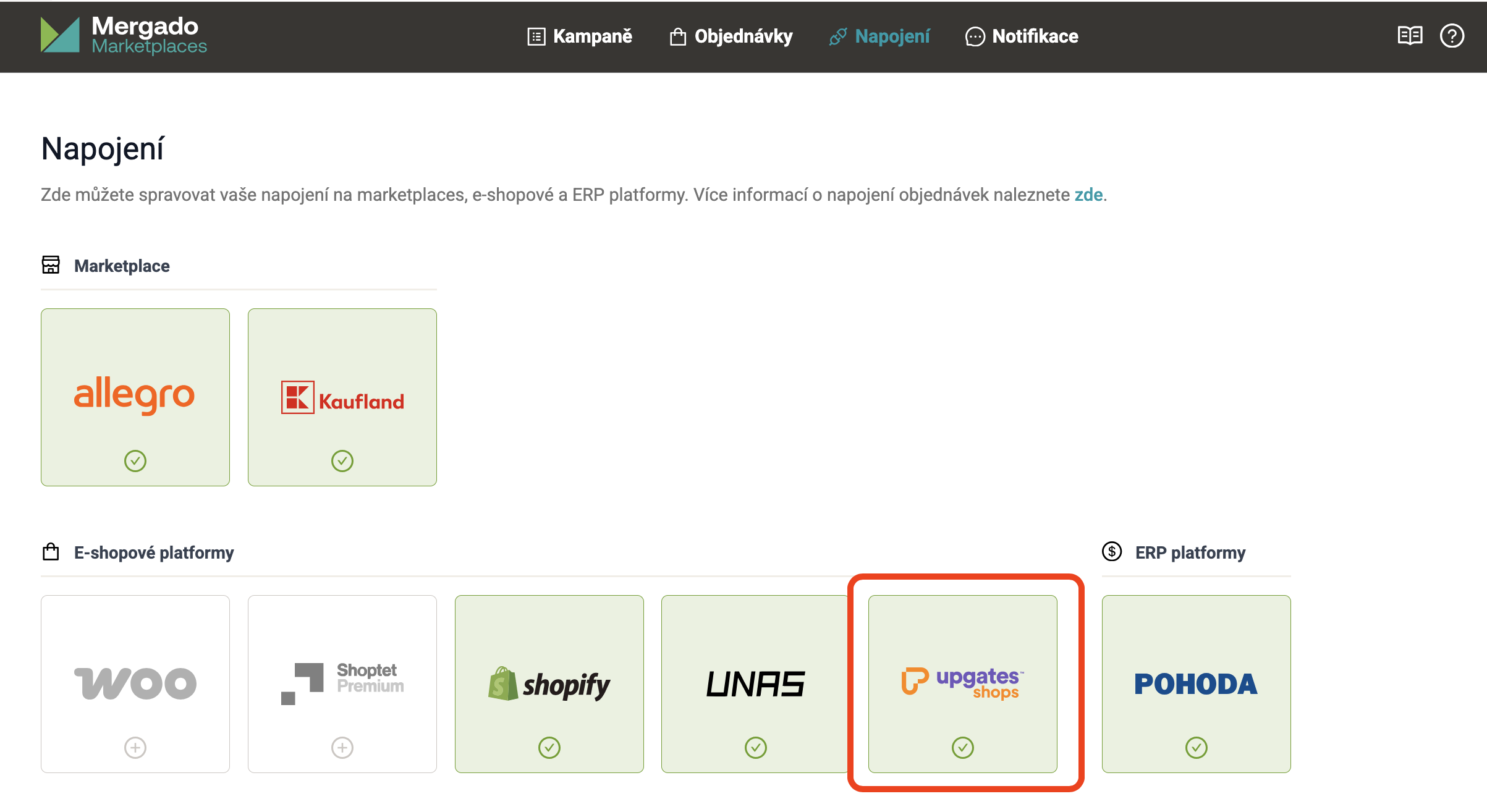 V sekci Napojení / e-shopové platformy je nyní nová možnost napojení na Upgates. Tato funkce umožňuje automaticky přenášet objednávky z Mergado Marketplaces přímo do administrace Upgates a dále s nimi pracovat stejně jako s ostatními objednávkami v e-shopu. Změny provedené u objednávek v Upgates se následně propisují zpět na daný marketplace.