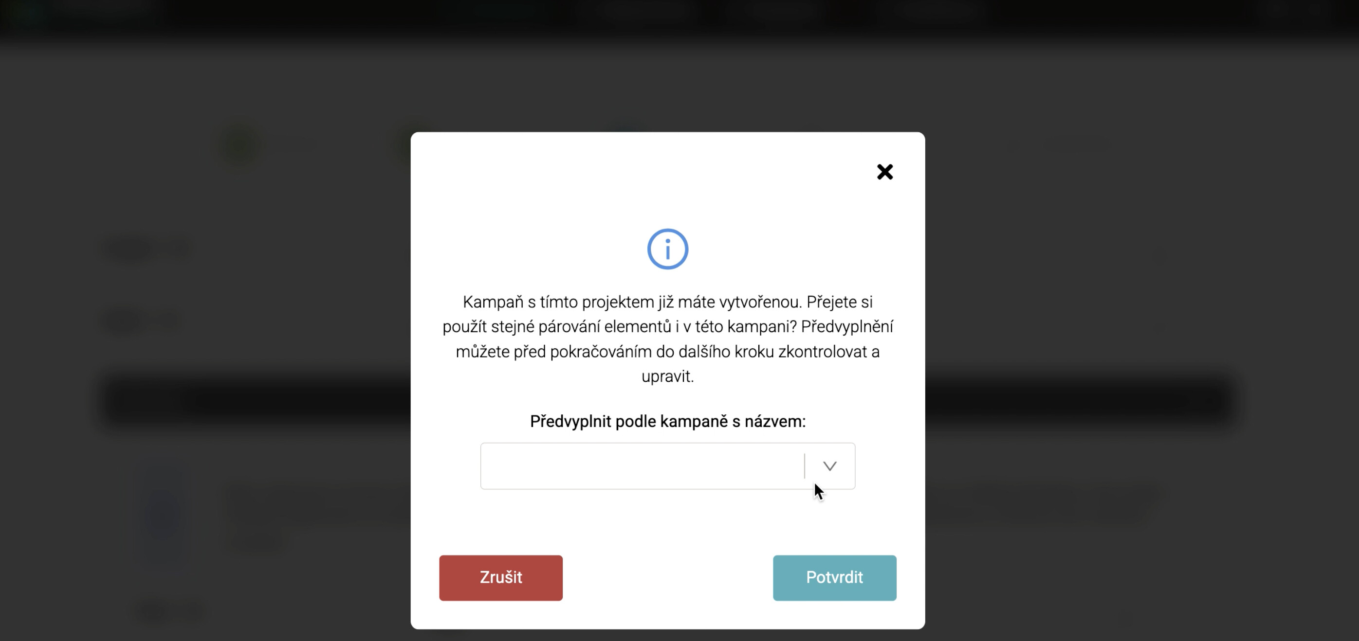 V novém release přidáváme funkci, která uživatelům usnadní vytváření dalších kampaní se stejným projektem. Pokud si uživatel při vytváření nové kampaně ve 3. kroku zvolí projekt, který už používá v jiné kampani pro daný marketplace, po výběru výběru (selection) se zobrazí pop-up s možností předvyplnění párování elementů. Uživatel tak může jednoduše převzít stejné nastavení z již existující kampaně.