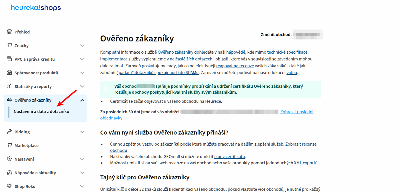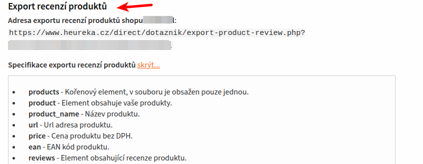 V administraci portálu Heureka přejděte do sekce: Ověřeno zákazníky → Nastavení a data zákazníků:Zcela dole na stránce je pak sekce s názvem Export recenzí produktů: