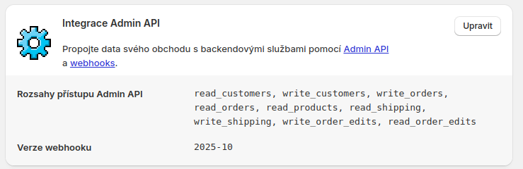 Pokud již máte v Mergado Keychain napojení na Mergado přes API prostřednictvím “vlastní aplikace” v Shopify administraci, stačí si u dané aplikace v Shopify upravit seznam oprávnění viz níže.