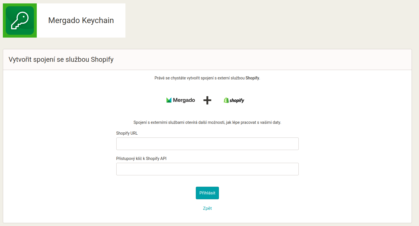 Pro připojení Shopify v Mergado Keychain je potřeba: