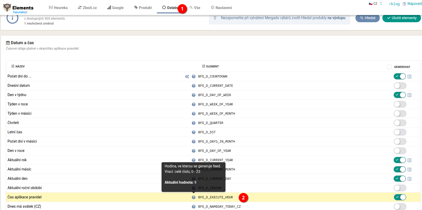 Bidding Fox Elements nejsou vázané na typ projektu (nemusí to být Heureka export/projekt), můžete si je zapnout kdekoliv a právě tato informace o čase aplikování pravidel je pak univerzální.